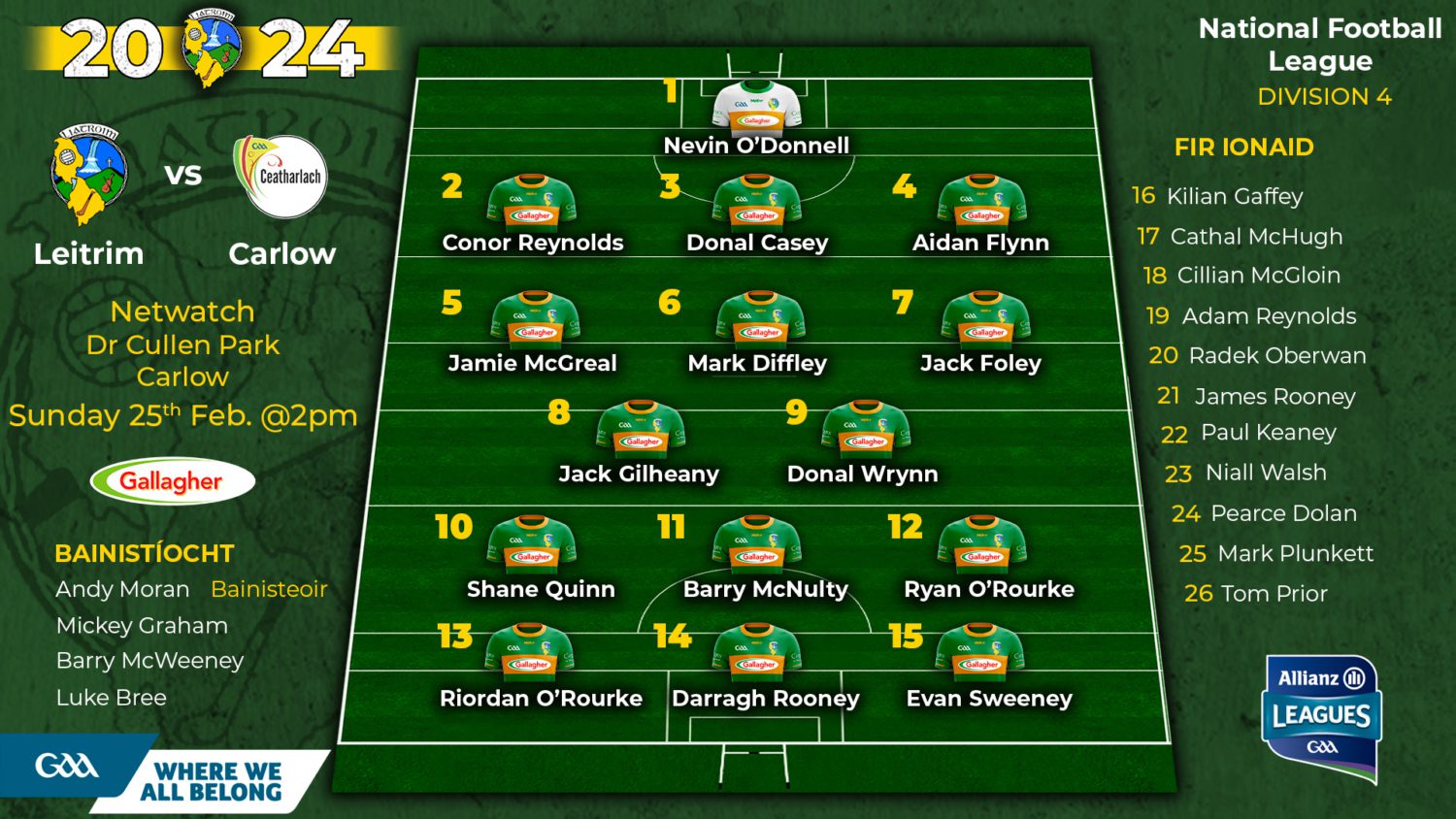 Leitrim Senior Team & Squad v Carlow Announcement