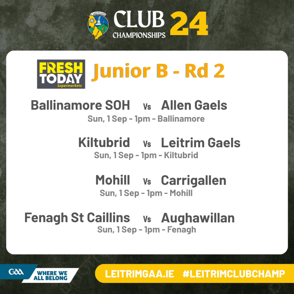 The fixture details for the Fresh Today Junior B – Round 2 have been released and are as follows: