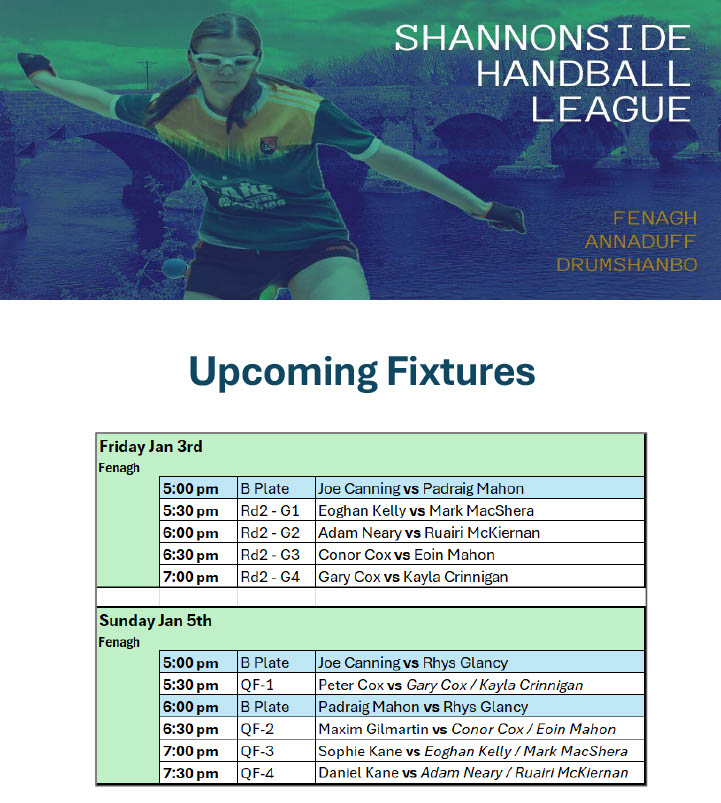 The Leitrim Handball Juvenile Christmas League reaches knockout stages this weekend in Fenagh, and competition is sure to heat up with some very exciting 2nd round and quarter final fixtures down for decision.