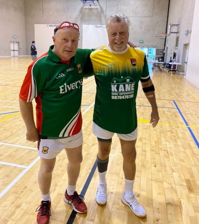 Leitrim’s Ed Lee is pictured with Mayo’s George Miller after their Connacht Wallball Diamond Masters Final on Sunday last.