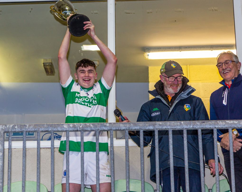 Presentation of Dick Ellis Memorial Cup to the winning captain Conor Canning by Cathaoirleach Coiste Chontae Liatroma Déaglán Ó Buacháin.