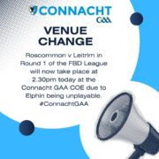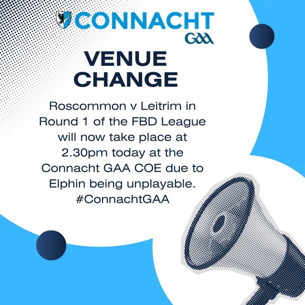 Due to an unplayable pitch in Elphin, today’s game v Roscommon in the FBD League will now be played in the Connacht GAA centre, Bekan, F12 WF21 at the later time of 2.30pm.