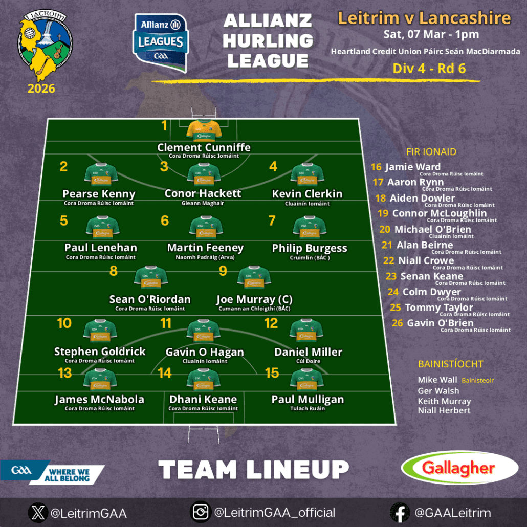 The Leitrim Senior Hurling panel has been named by manager Mike Wall for round 6 of the National Hurling League.