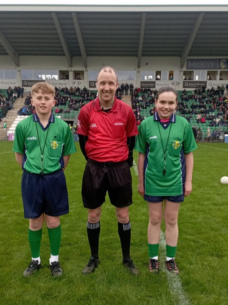 Young Whistlers, Ryan & Caitlín, referees for the Cumann na mBunscol halftime exhibition games, pictured with Niall Cullen of Fermanagh at yesterday’s Connacht semi-final.